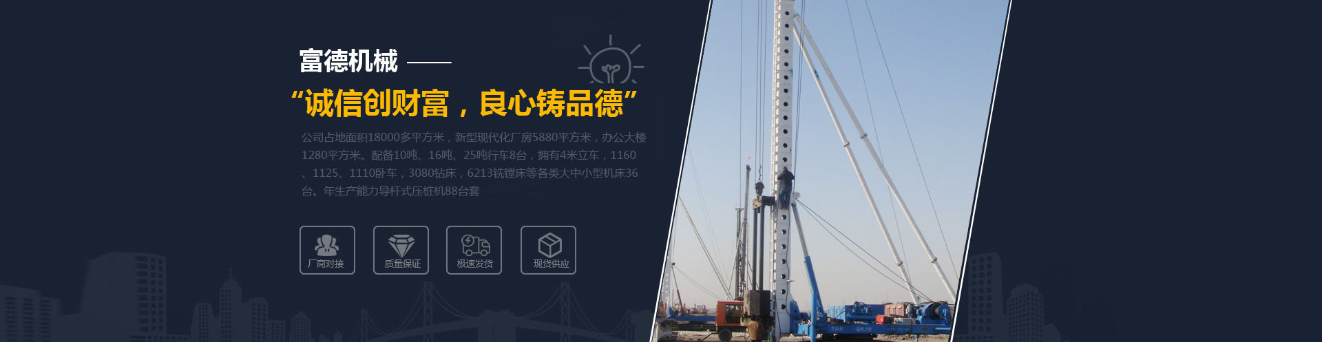 東臺市富德機(jī)械有限公司位于江蘇東臺經(jīng)濟(jì)開發(fā)區(qū),自然條件優(yōu)厚,廠區(qū)環(huán)境優(yōu)美,交通運(yùn)輸便捷。公司占地面積18000多平方米,新型現(xiàn)代化廠房5880平方米,辦公大樓1280平方米。配備10噸、16噸、25噸行車8臺,擁有4米立車,1160、1125、1110臥車,3080鉆床,6213銑鏜床等各類大中小型機(jī)床36臺。年生產(chǎn)能力導(dǎo)桿式壓樁機(jī)88臺套,同行業(yè) 。產(chǎn)品暢銷北京、天津、廣東、廣西、海南、福建、浙江、上海、安徽、山東、山西、陜西、甘肅、湖北、湖南、江蘇等20多個省……